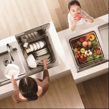 水槽洗碗机外观上和普通水槽类似,并在一侧水槽内融入了洗碗和果蔬净化两大功能,属于半嵌入式洗碗机。洗碗机和水槽融为一体,这样可以最大限度的节约厨房的空间。纯平控制面板,设计简洁大方,富有美感,可搭配多种家装风格。