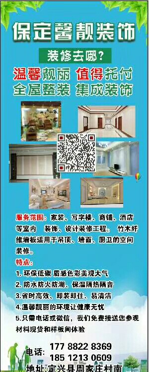 保定馨靚装饰工程有限公司:主营竹木墙板销售装饰、集屋整装及传统装修 崇尚环保,并践行品质责任。为您呈现温馨靓丽的起居、工作和商用环境 合作热线:177 8822 8369