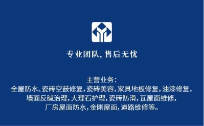 主营业务:全屋防水、瓷砖空鼓修复,瓷砖美容,家具地板修复,油漆修复,墙面反碱治理,大理石护理,瓷砖防滑,瓦屋面维修,厂房屋面防水、金刚屋面,道路维修等。